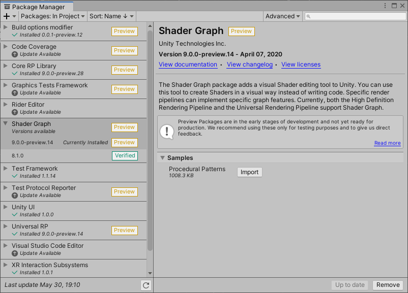 To add samples to your Project, go to Window > Package Manager. Locate Shader Graph in the list of available packages, and select it. Under the package description, there is list of available samples. Click the Import into Project button next to the sample you wish to add.