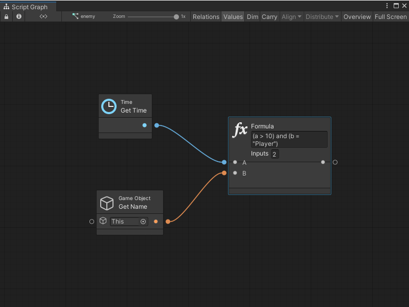 Variable names can be directly used in the formula. For example, a graph variable named health can return a boolean just by typing the formula health > 50. The argument names are evaluated in the following order of priority: